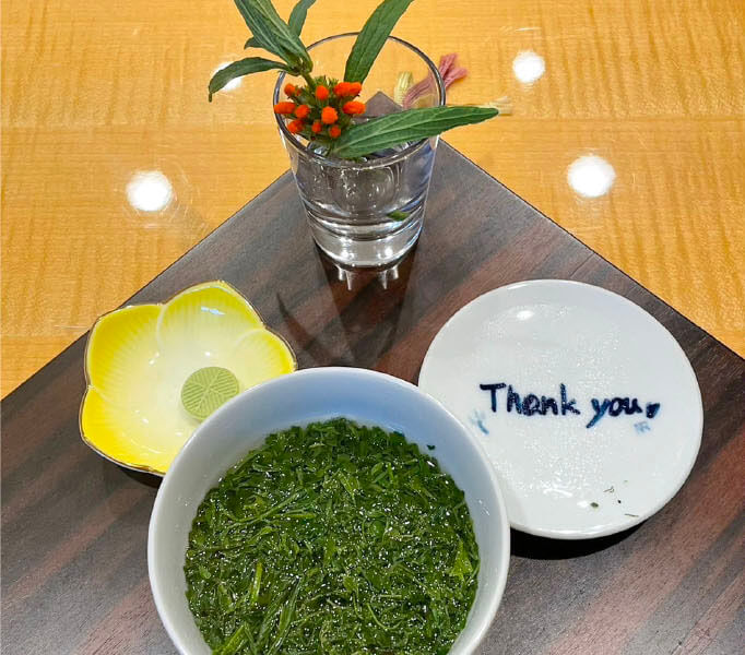 お茶だけでなく、器も嬉野産で揃え、ひとつひとつ丁寧に手描きをさせていただき、only oneの場を創り上げることができました。完全予約制です。歴史や文化・植物など多岐にわたり楽しい茶話が繰り広げられる場。『ゆとり茶』にて、心づくしのおもてなしをいたします。